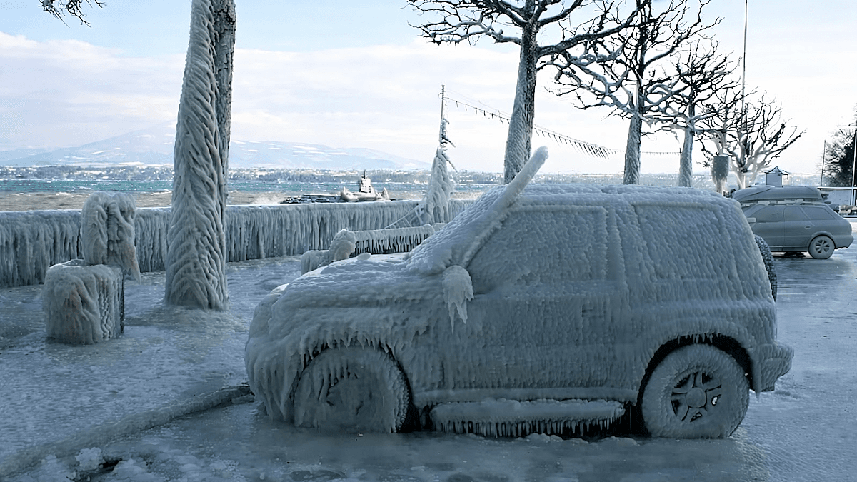 Véhicules totalement figés dans la glace sur les bords du Lac Léman lors de la vague de froid de février 2012