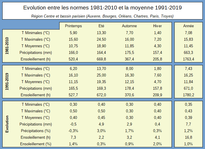 Evolution entre les normes 1981-2010 et la moyenne 1991-2019 sur la région Centre et le Bassin Parisien - Météo-France