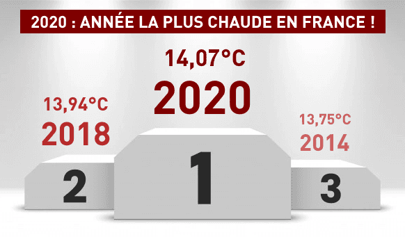 Cette tendance chaude semble s’affirmer d’années en années, en effet 9 des 10 années les plus chaudes ont été observées au 21ème siècle, à savoir 2020, 2018, 2014, 2019, 2011, 2003, 2015, 2017 et 2006. Seule l’année 1994 résiste à la 10ème place de ce classement.