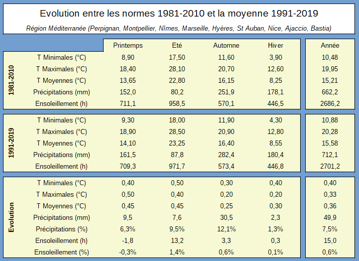 Evolution entre les normes 1981-2010 et la moyenne 1991-2019 sur les régions méditerranéennes - Météo-France