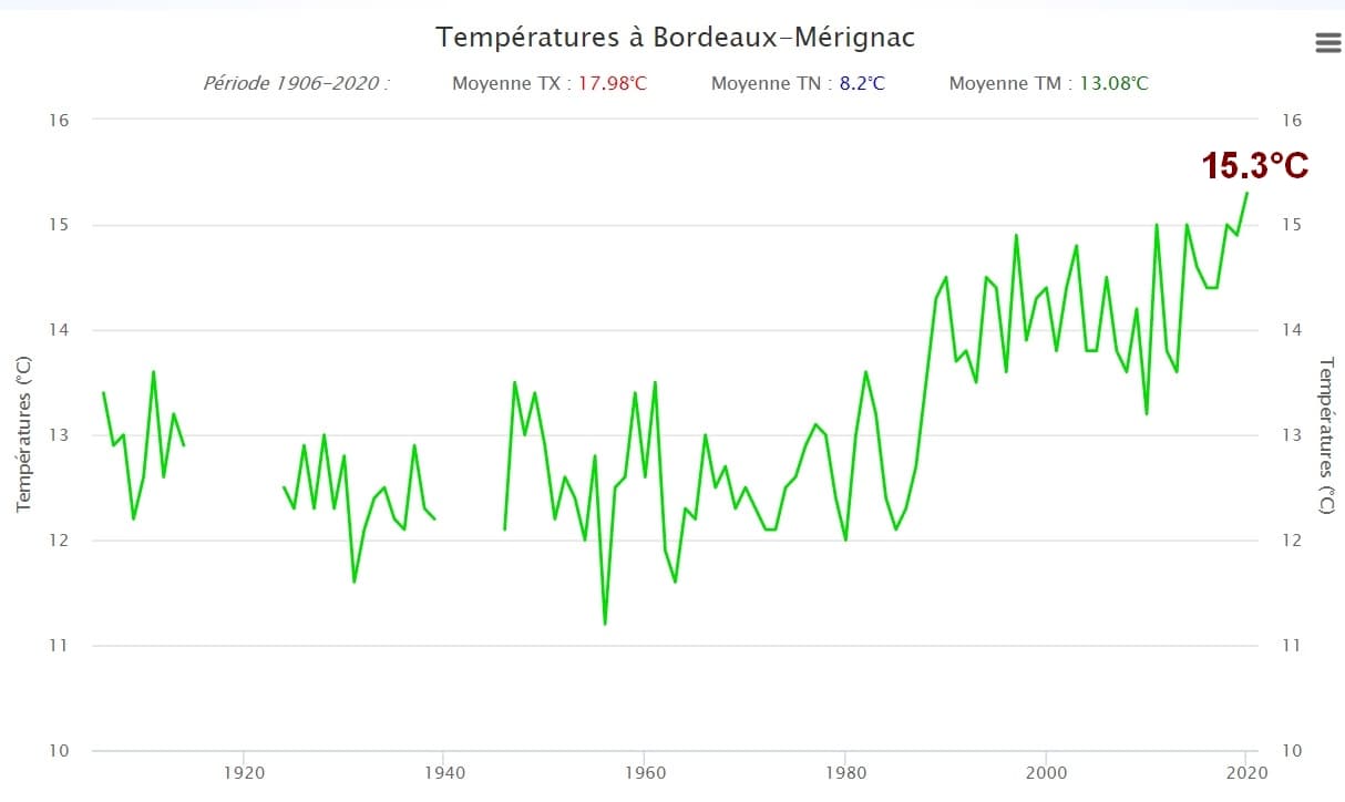 A Bordeaux, si le réchauffement était moins franc entre 1900 et 1990, celui-ci s’est également accentué depuis la fin du 20ème siècle, là encore l’année 2020 fut la plus chaude avec une température moyenne de 15.3°C, 0.3°C de plus que 2018, 2014 et 2011.