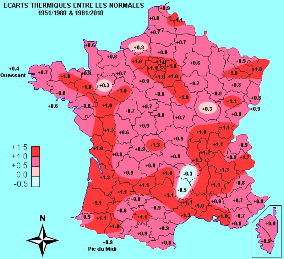 Ecarts thermiques entre les normales de référence 1981-2010 et 1951-1980 – Via Terre-net.fr