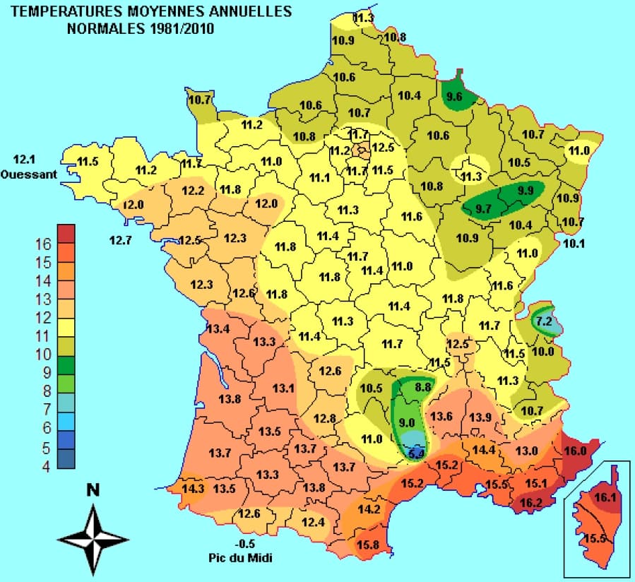 Températures moyennes annuelles pour de nombreuses villes françaises durant la période de référence 1981-2010 – Via Terre-net.fr