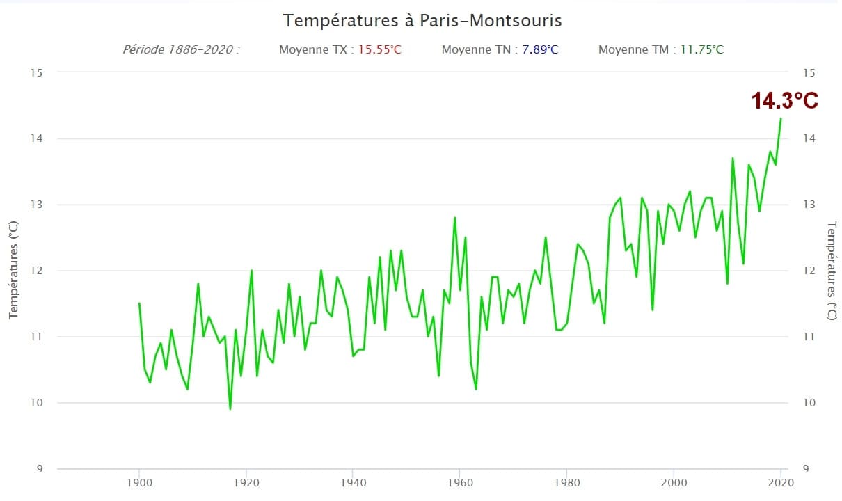 Evolution des températures moyennes annuelles à Paris-Montsouris depuis 1900 – Via Infoclimat.fr