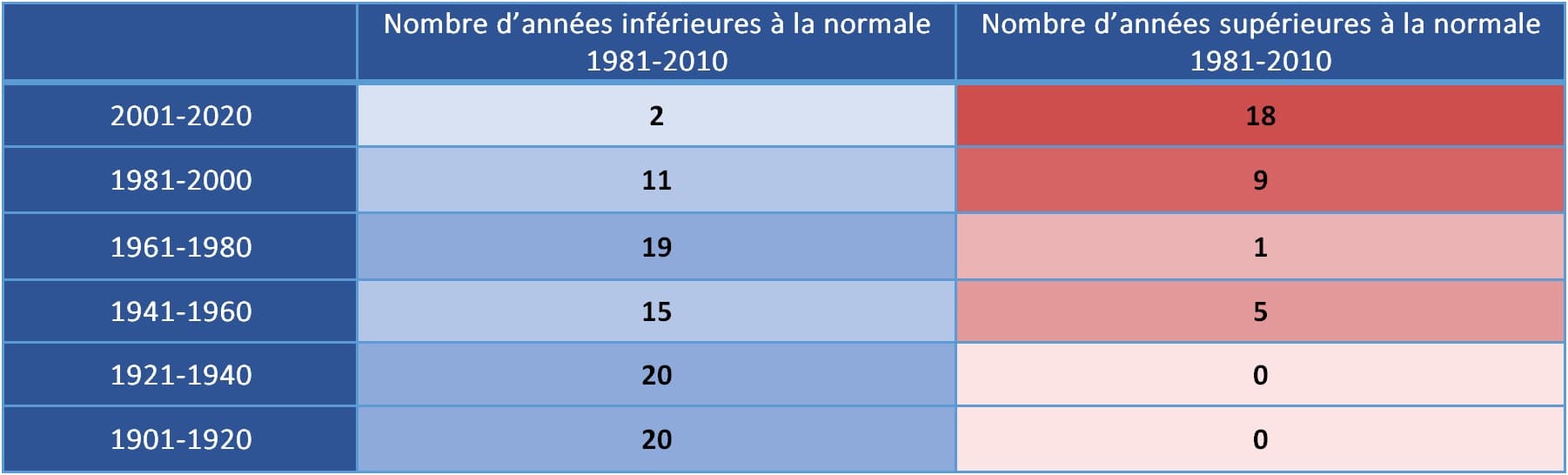 Ainsi, en considérant les stations météorologiques les plus anciennes, on ne retrouve pas de période trentenaire aussi chaude que ces trois dernières décennies sur le pays, et pas de décennie aussi chaude que la période 2010-2020.