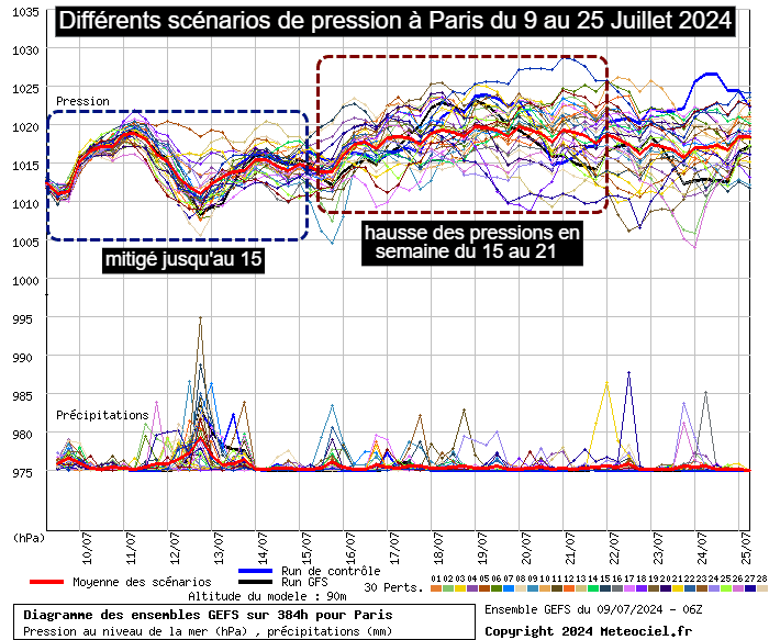 Différents scénarios de pression à Paris du 9 au 25 juillet 2024 - meteociel.fr