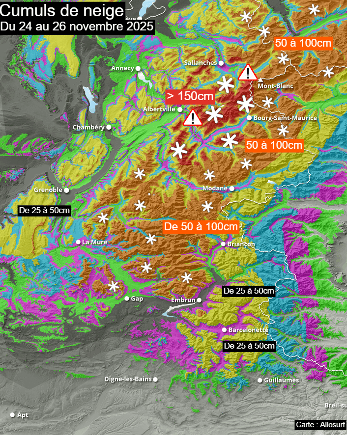 Si ces quantités très importantes de neige seront bienvenues pour les stations de la région, dont certaines ouvrent d'ailleurs dès ce week-end comme Chamonix ou Les 2 Alpes, il conviendra de rester prudents si vous comptez vous rendre en moyenne montagne sur le nord des Alpes dans les prochains jours.