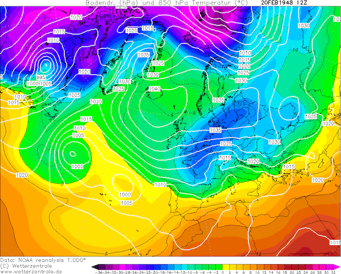 L'air glacial qui descend de la mer baltique vers la France, le 20 février 1948 - Source : Wetterzentrale