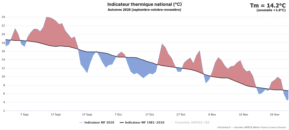 L’hiver calendaire n’est pas encore arrivé (21 décembre), mais d’un point de vue météorologique, ce dernier a débuté depuis le 1er décembre. L’occasion d’effectuer le bilan climatologique de l’ AUTOMNE 2020 (mois de septembre, octobre et novembre) en termes de température, pluviométrie et ensoleillement, sur notre panel de 73 stations métropolitaines*.