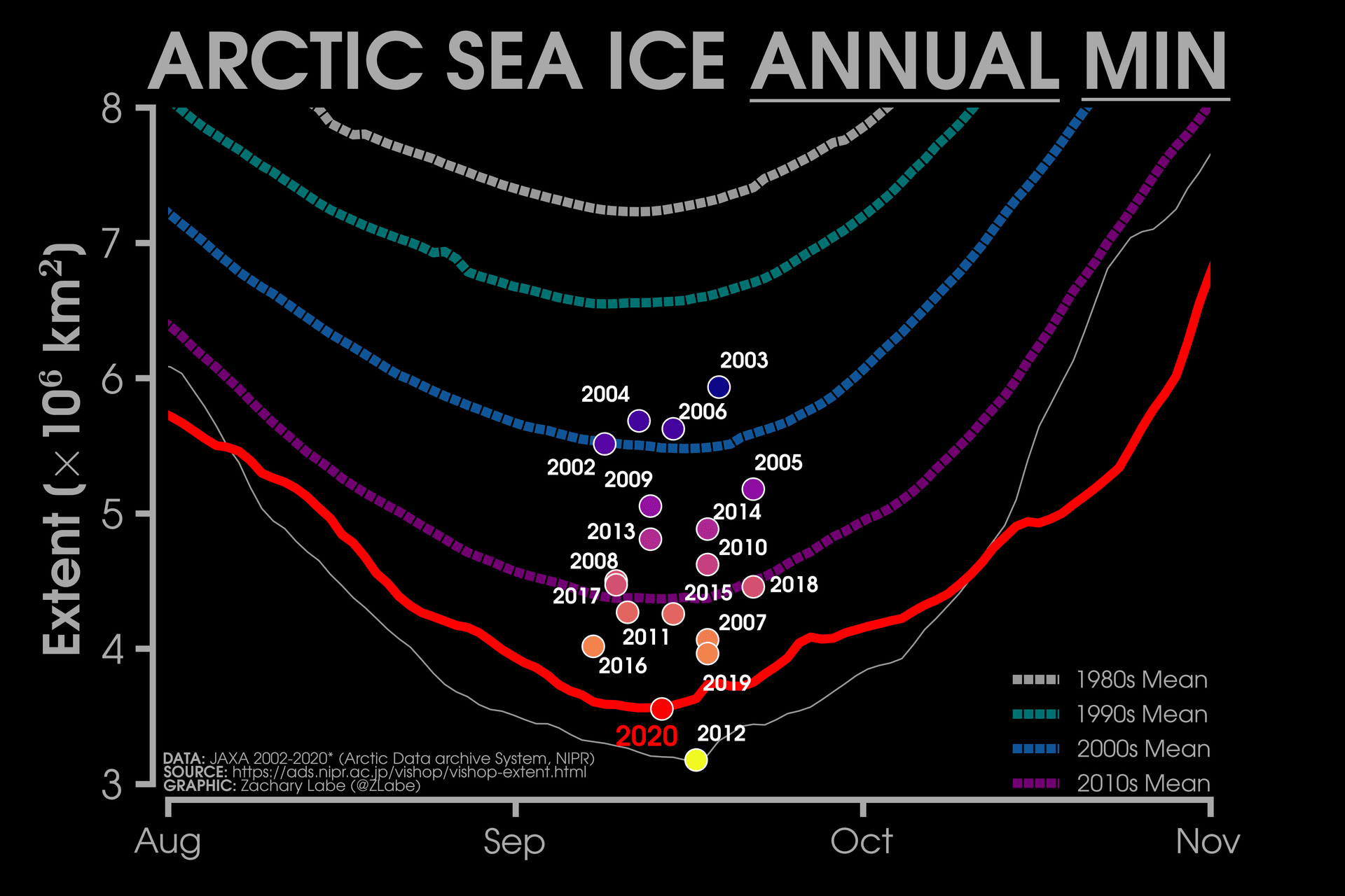 L’automne se poursuit et le cœur de la saison froide approche à grands pas sur l’Hémisphère Nord. Au-delà du cercle Arctique, ceci se répercute par une reformation progressive des glaces. Mais malheureusement, nous partons de très bas en cette année 2020 : en effet pour rappel, l’extension des glaces avait atteint 3.74 millions de km2 le 15 septembre. Il s'agissait de la 2e fois seulement où cette banquise chutait sous les 4 millions de km2 depuis le début des analyses satellitaires, juste derrière le record de l’été 2012.