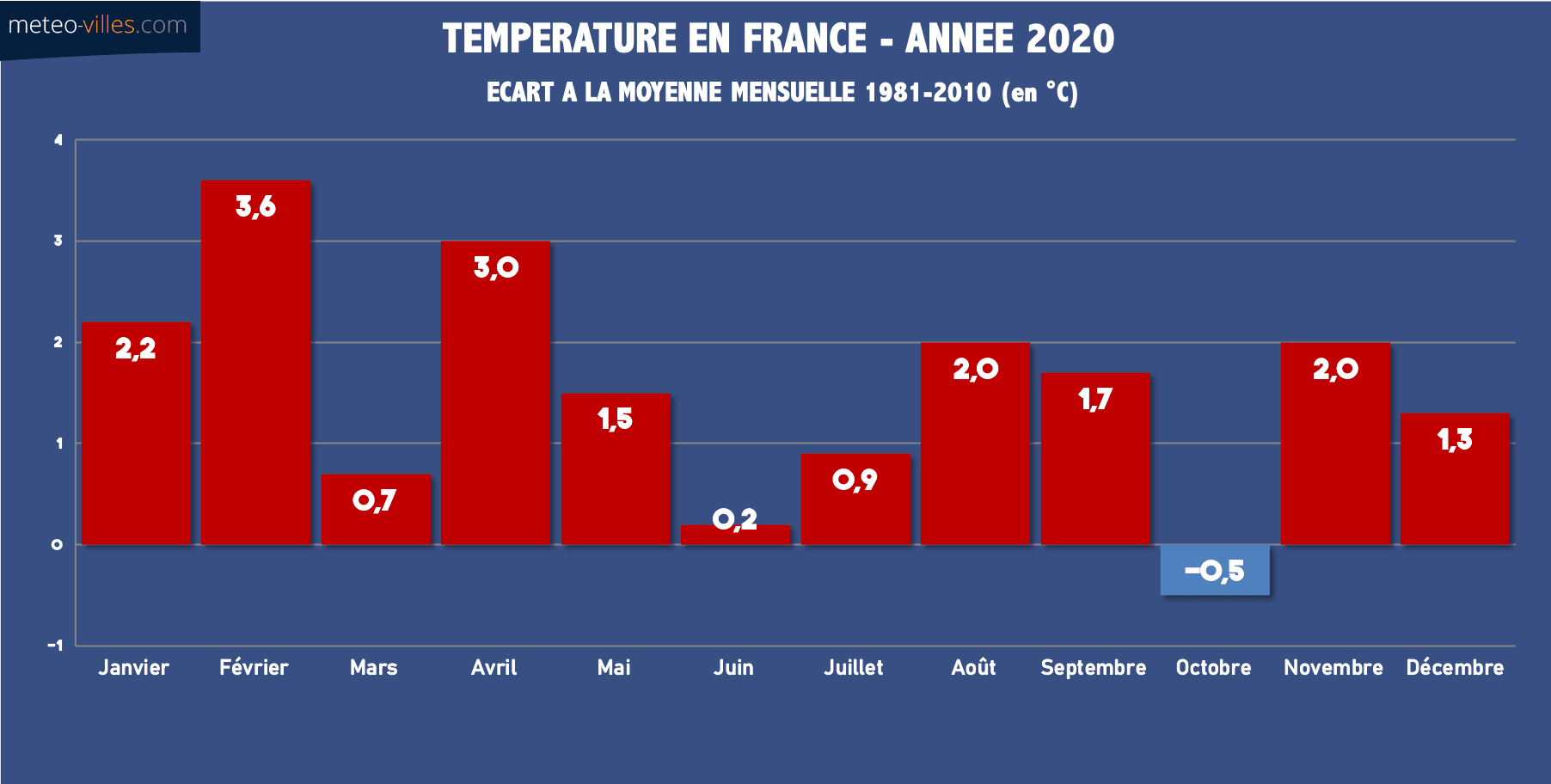 La moyenne annuelle en France (1981-2010) est légèrement supérieure à 12.5°C. L'anomalie thermique de cette année 2020 était donc de l'ordre de +1.5°C, mais ceci cache des disparités. En effet, cette anomalie était encore plus importante en se dirigeant vers les régions du Nord et de l'Est, où celle-ci a approché voire dépassé les +2°C (maximum sur notre panel de +2.2°C à Langres, +2.1°C à Lyon, +2.0°C à Saint-Quentin, Mâcon, Troyes, Bourges et Nevers). Pour Paris-Montsouris, cette année 2020 s'est terminé sur une anomalie de +1.9°C.