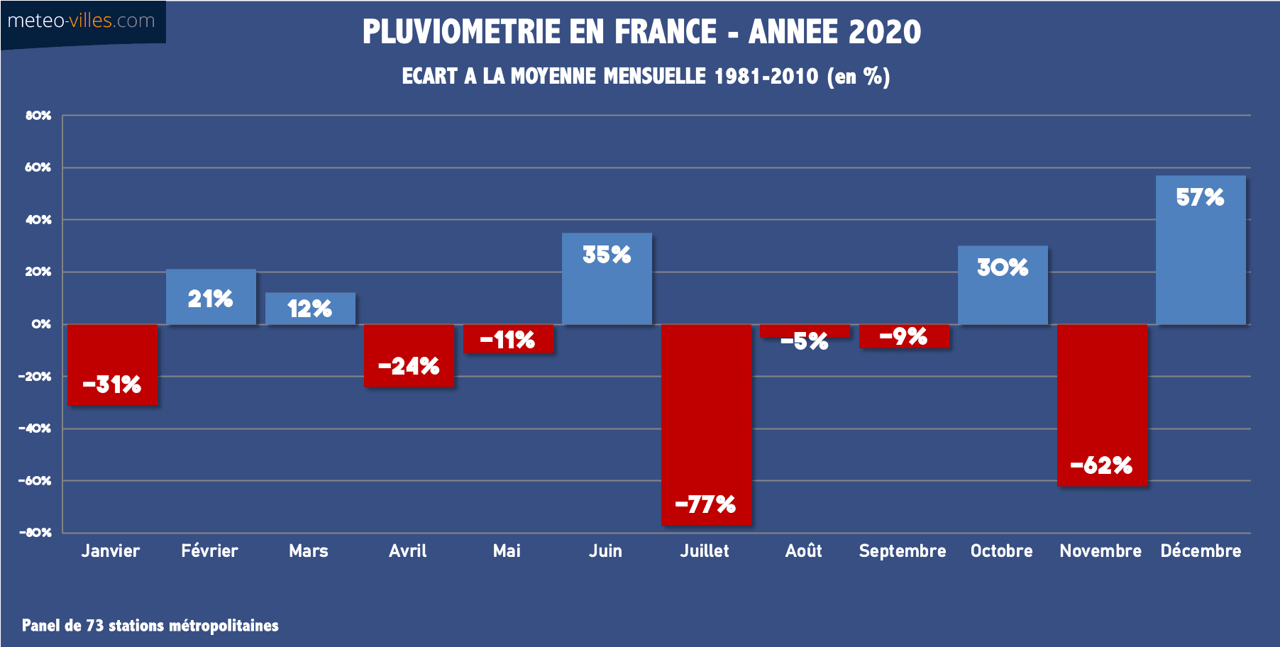 Sur ce panel composé de 73 stations principales, le bilan fait état de 5 mois avec excédent contre 7 mois avec déficit pluviométrique. Toutefois, notons que les mois de juillet et de novembre ont été remarquablement secs sur le pays avec trois à quatre fois moins de pluie qu'à l'accoutumée (consécutivement -77% et -62%), juillet ayant été le mois le plus sec depuis 1959 (>>).
