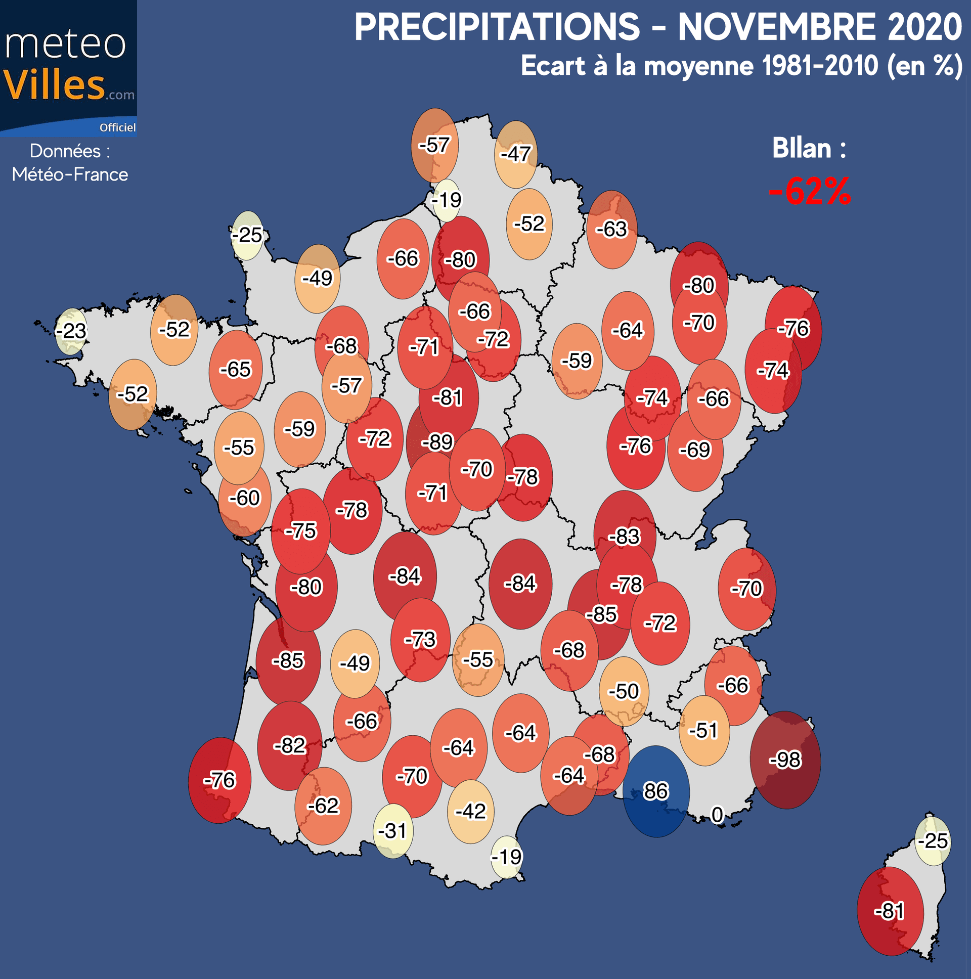 Ailleurs, une véritable Bérézina avec de nombreuses régions sous les 20mm seulement. Par endroit, le cumul est même anecdotique : seulement 2mm à Nice, 6mm à Clermont-Ferrand, 7mm à Romorantin, 9mm à Saint-Etienne ! Paris ne s’en sort pas beaucoup mieux avec 17 maigres millimètres récoltés durant ce mois de novembre.