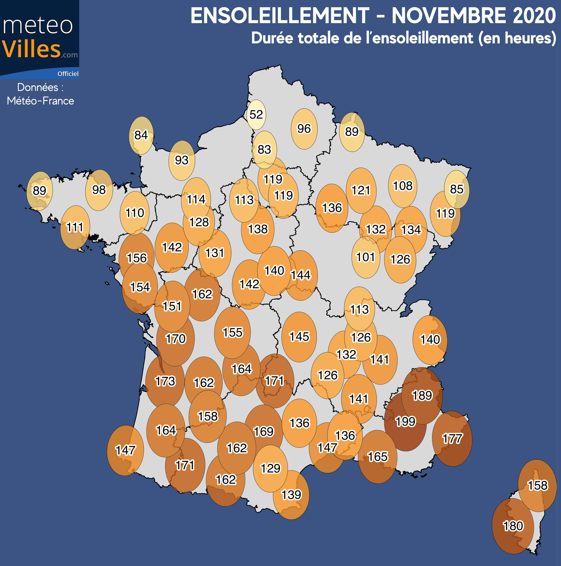 Hormis le long des côtes de la Manche ainsi que près de la Méditerranée, l’excédent d’ensoleillement a été tout bonnement exceptionnel, parfois jamais vu à cette époque de l’année. Sur une large bande s’étalant de la Nouvelle-Aquitaine au Grand-Est, cet excédent dépasse les 80%. Dans plusieurs villes du Nord-Est, la durée d’ensoleillement a été deux fois supérieure à un mois de novembre normal (>100%) : il s’agit de Nevers (+120%), Langres (+117%), Nancy et Saint-Dizier (+108%), Troyes (+104%) et Luxeuil (+100%).