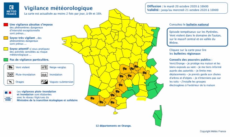 Carte de vigilance en vigueur le mardi 20 octobre 2020 à 16h - via Météo France