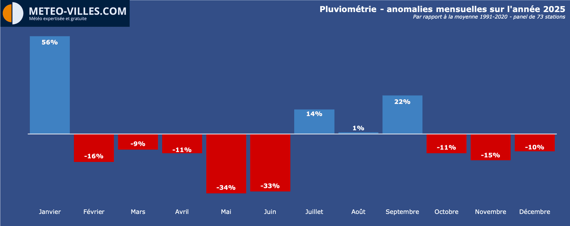 Anomalies mensuelles de pluviométrie en France sur l'année 2025 - écarts à la moyenne de la période 1991-2020