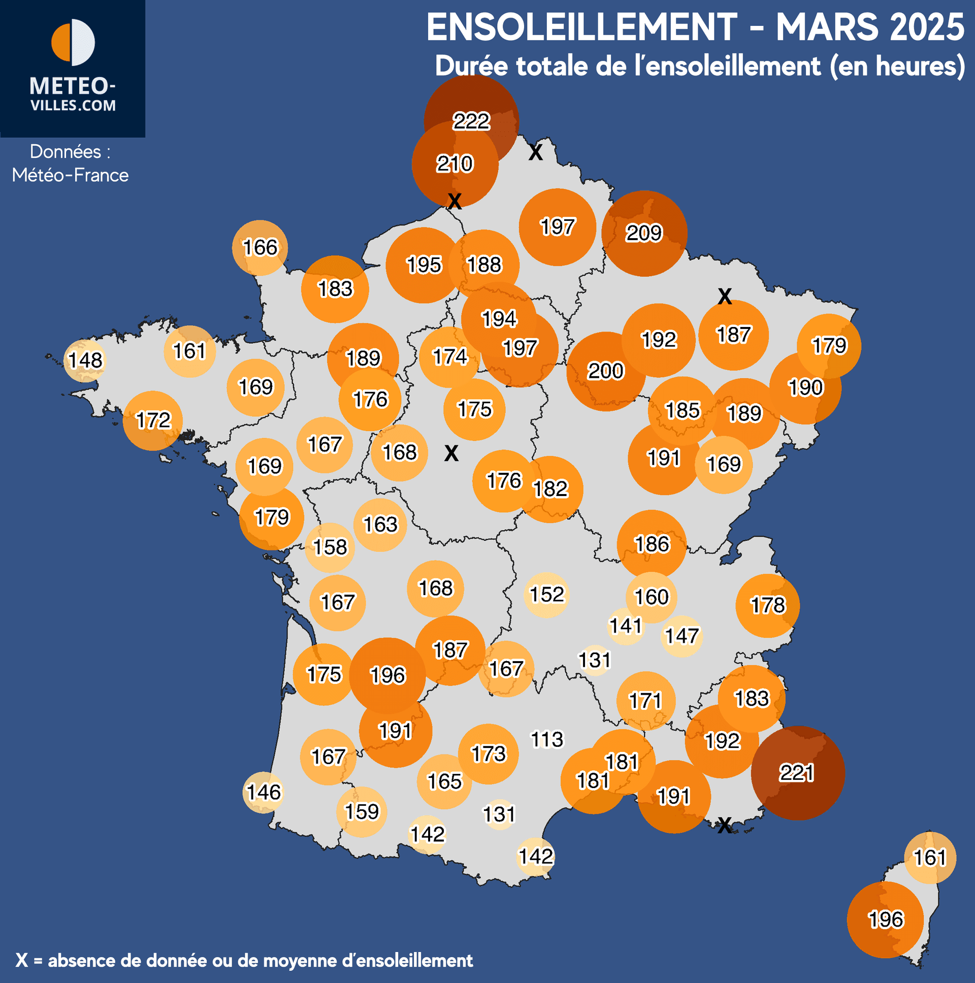 Car oui, la ville la plus ensoleillée de France au mois de mars, est également l'une des plus septentrionales du pays : il s'agit de Calais avec 222 heures de soleil pour ce mois ! Si Nice (221h) vient s'intercaler, se sont bel et bien des villes du Grand-Est où des Hauts-de-France qui se situent en tête en dépassant les 200 heures (218h à Reims, 210h au Touquet, 209h à Charleville-Mézières, 206h à Valenciennes). Plus globalement, toutes les villes au Nord de la Seine ont observé plus de 180 heures au soleil en mars (194h à Paris).