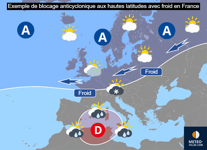 Le problème étant que l'absence de flux océanique et la présence d'un blocage anticyclonique aux hautes latitudes ne garantit pas forcément l'arrivée du froid jusqu'en France car de nombreuses variables existent. Il faut tout d'abord s'intéresser au positionnement exact de l'anticyclone nordique mais aussi et surtout à celui des dépressions au sud de la cellule anticyclonique, pouvant s'étirer notamment entre les Açores et la Méditerranée. Dans l'hypothèse où une anomalie dépressionnaire se positionnerait à proximité du Portugal, la France se retrouverait en flux de sud-est avec un air doux remontant par la Méditerranée, et ce malgré le puissant anticyclone aux hautes latitudes.