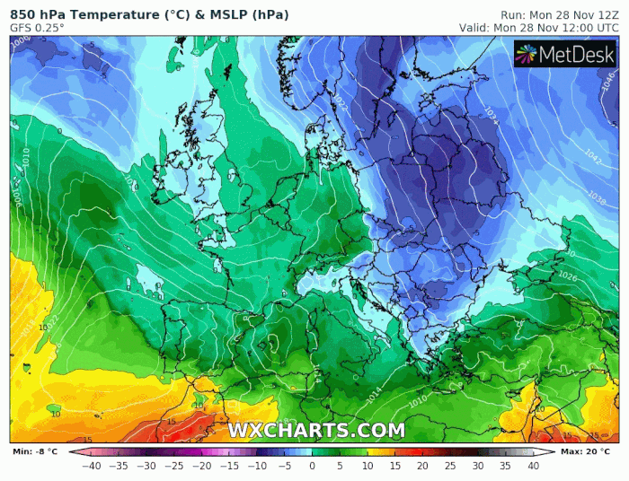 Masse d'air à 850 hPa (vers 1500m) du lundi 28 novembre au dimanche 4 décembre 2022 - via wxcharts.com
