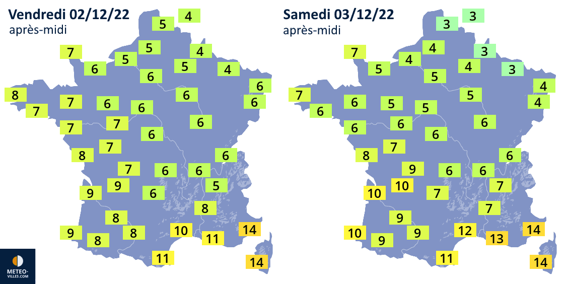 Températures maximales prévues les vendredi 2 et samedi 3 décembre 2022 - Météo Villes
