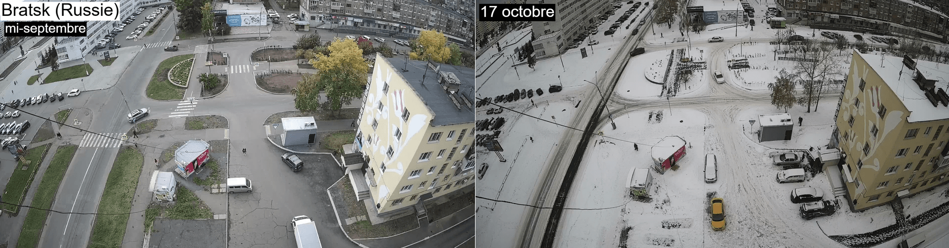Comme évoqué précédemment, la neige a fait un retour plus franc du côté de la Russie ces derniers jours. Exemple du côté de Bratsk où la neige tient maintenant au sol depuis plusieurs jours alors que le temps était encore bien clément autour de la mi-septembre.