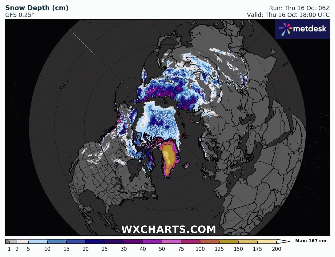 Évolution de la couche de neige sur l'hémisphère nord jusqu'au 31 octobre 2025 – Modèle GFS via WX CHARTS