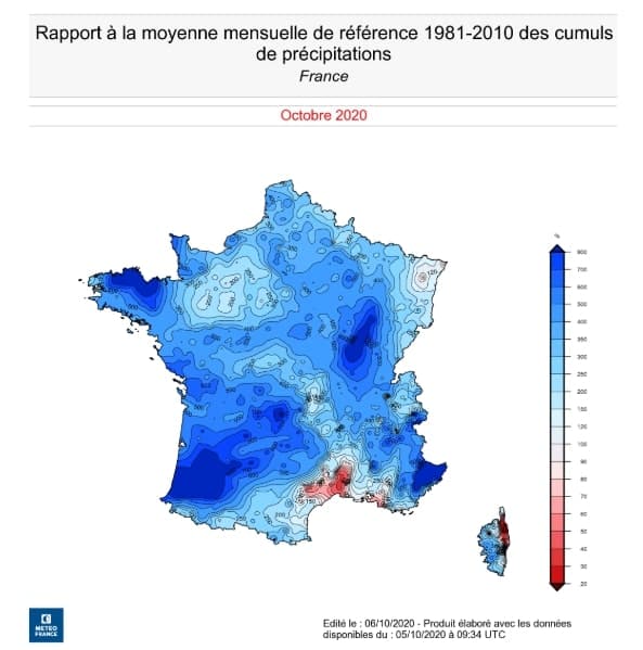 La forte humidité ambiante favorise également la création de ces gouttelettes et donc l’expansion de l’épidémie. Or, depuis la fin du mois de septembre et notamment après le passage de la tempête Alex les conditions sont très perturbées en France avec une succession de perturbations et une humidité ambiante souvent élevée. Les cumuls moyens mensuels sont en effet excédentaires sur la majeure partie du pays :