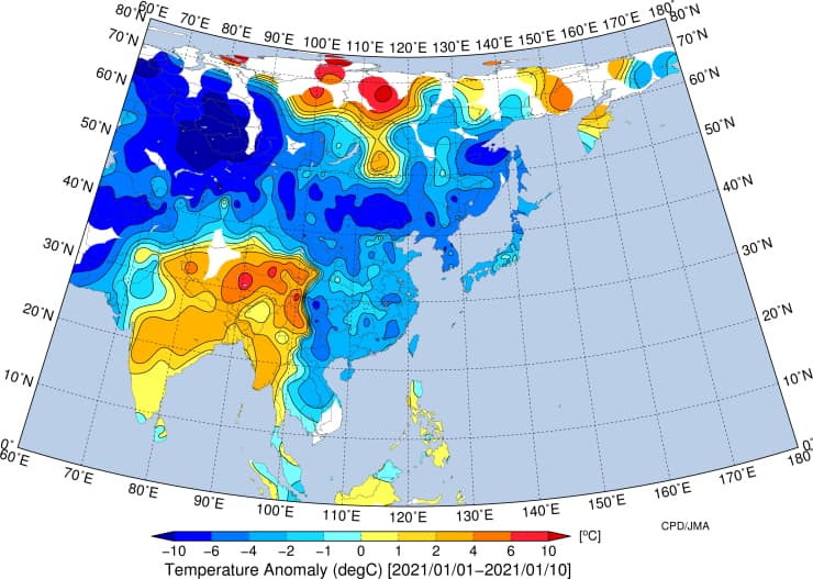 Anomalies thermiques en Asie en première décade de janvier 2021 - via JMA