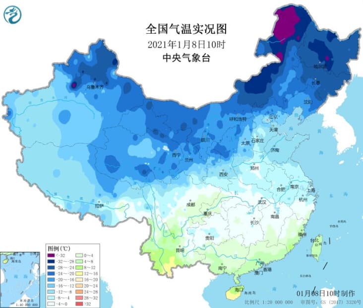 Températures minimales en Chine le 8 janvier 2021 - via extremetemps