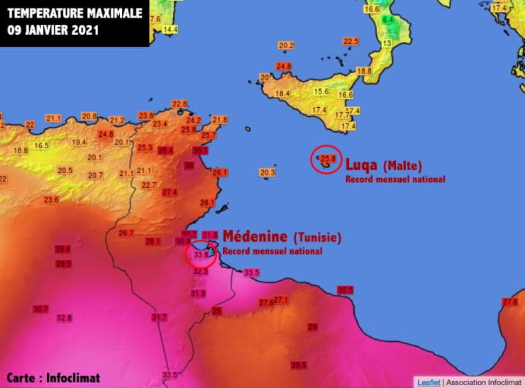Records de chaleur entre Tunisie et Malte le samedi 9 janvier 2021 - via Infoclimat