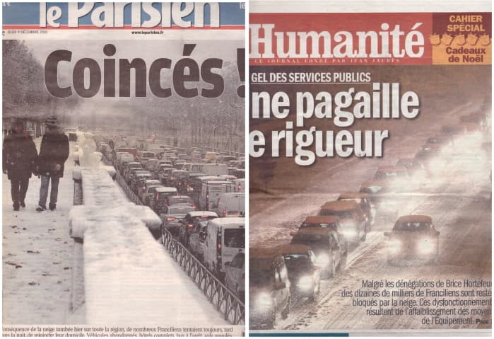 Extrait de unes des journaux Le Parisien et L'Humanité du 9 décembre 2010, suite à la grande pagaille en Île-de-France...