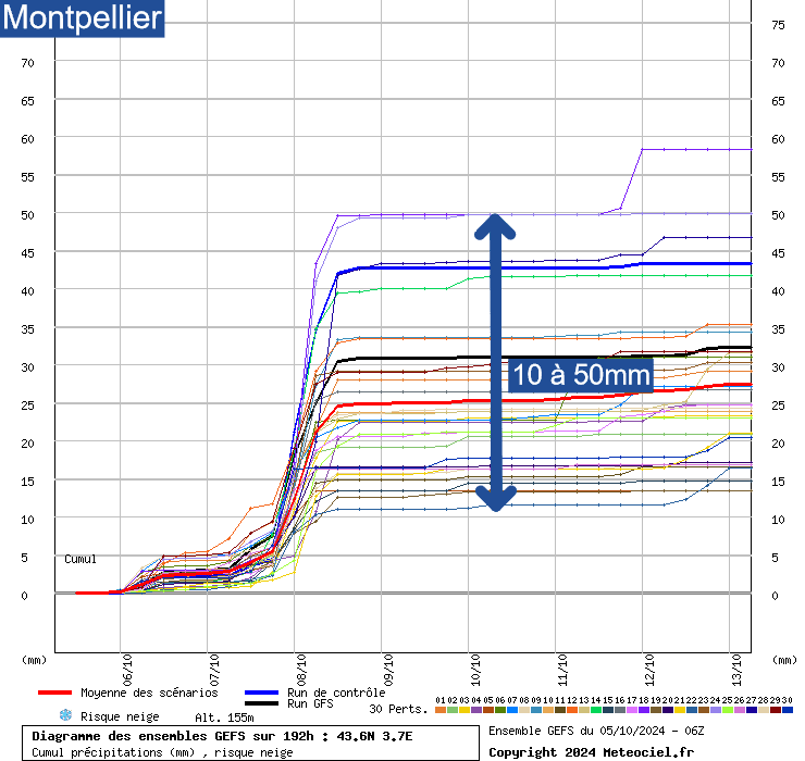 A Montpellier, des cumuls de 10 à 50mm sont attendus, avec une médiane située autour de 25mm.