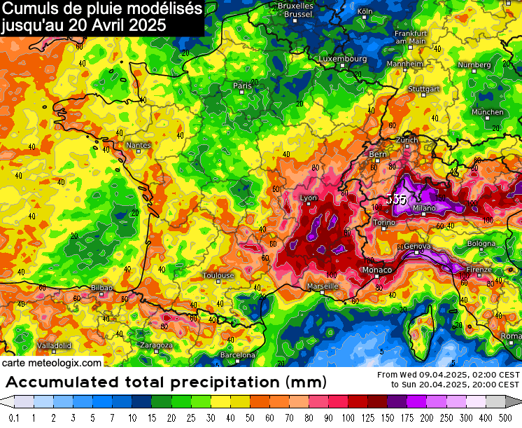 Cumuls de pluie modélisés jusqu'au dimanche 20 avril 2025 - meteologix.com