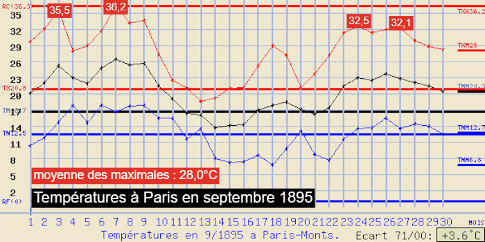 À Paris, la première décade du mois de septembre 1895 avait été remarquablement chaude avec des températures atteignant 35,5°C le 3 septembre puis 36,2°C le 7 septembre !