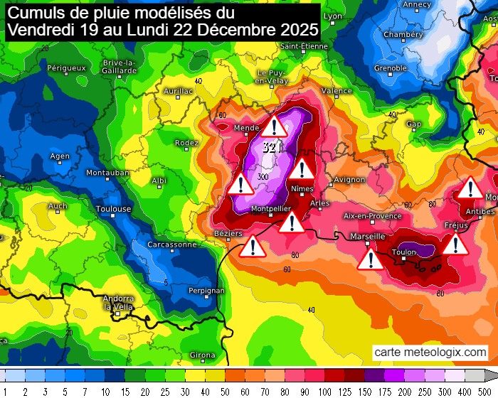 Plus que son intensité, c'est la durée de cet épisode qui sera marquante. En effet, les pluies sont déjà présentes ce vendredi 19 décembre 2025 et vont se prolonger jusqu'au lundi 22 décembre avec très peu de périodes d'accalmie, notamment aux abords des Cévennes où sont attendus les cumuls les plus importants. Il tombera 200 à 300 mm en moyenne mais la barre des 400 mm pourrait être atteinte localement ! Les cours d'eau risquent donc d'entrer en crue. Des pluies copieuses concerneront aussi PACA avec souvent 70 à 100 mm des Bouches-du-Rhône aux Alpes-Maritimes, voire 150 mm sur le sud du Var !