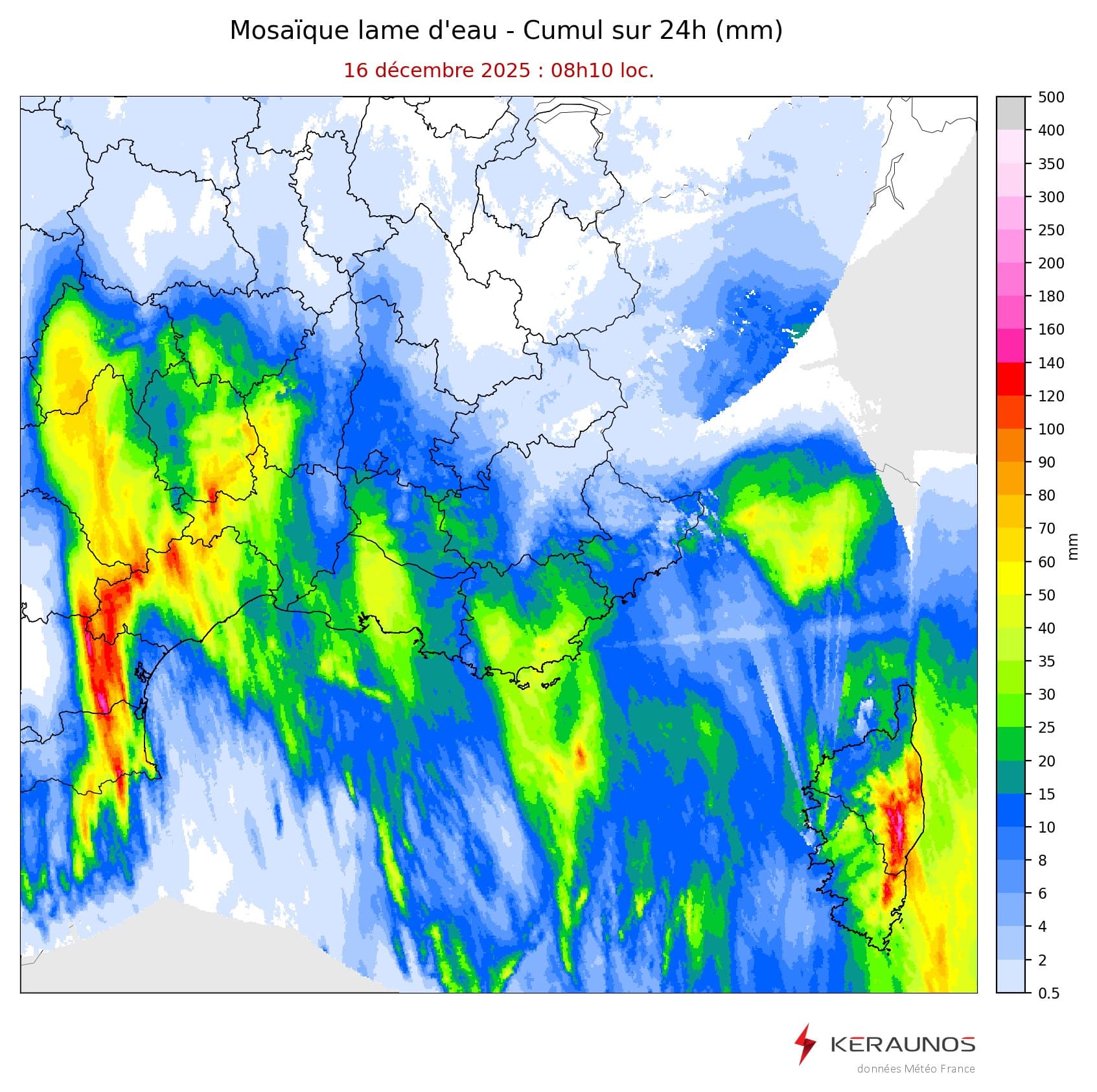 Cumuls de pluie sur 24h le lundi 15 décembre 2025 - carte keraunos.org