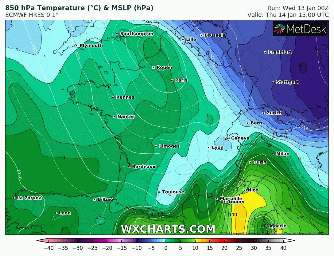 L'animation précédente permet également de remarquer l'arrivée d'un air plus radouci durant la journée du 16 janvier, matérialisant un front océanique s'avançant peu à peu sur la France d'Ouest en Est. Ce front traversera l'hexagone, atteignant le Nord des Alpes en cours de nuit de samedi à dimanche. Vu l'air froid encore présent, la neige devrait se montrer majoritaire avant l'arrivée de l'air océanique, un épisode caractéristique de neige de redoux.