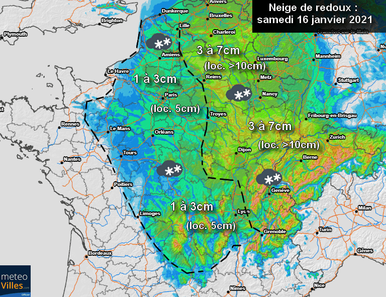 Il est important de différencier la couche de neige au sol et les cumuls neigeux prévus car ceux-ci peuvent grandement varier suivant les secteurs. La couche de neige au sol peut se montrer bien moins importante que la quantité de neige prévue, ce sera notamment le cas sur la Normandie, le Perche et le Centre avec un redoux intervenant en fin de front, permettant à la pluie de remplacer la neige. La couche neigeuse pourrait donc se montrer plus éphémère sur ces secteurs même si les cumuls prévus sont par endroit notables.