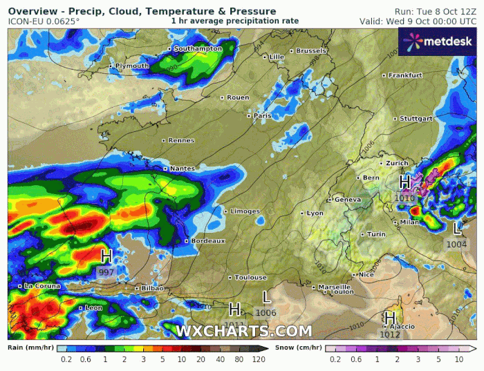 Précipitations par pas d'une heure ce mercredi 9 octobre 2024 - wxcharts.com