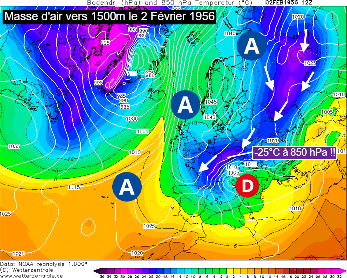 Masse d'air à 850 hPa (vers 1500m) le 2 février 1956 - wetterzentrale.de