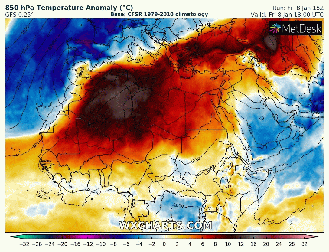 Nous pouvions réellement parler de chaleur, et même de fortes chaleurs durant l'après-midi de samedi sur la Tunisie, avec des températures parfois dignes d'un début d'été ! Le pic a été atteint du côté de Médenine, avec une valeur incroyable : 33.8°C ! Il s'agit tout simplement d'un nouveau record de chaleur en Tunisie pour un mois de janvier, explosant l'ancien record détenu par cette même ville le 28 janvier 1979 (31.3°C). Pour information, la température dite "normale" en janvier sur ce poste n'est pourtant que de 17.5°C ...