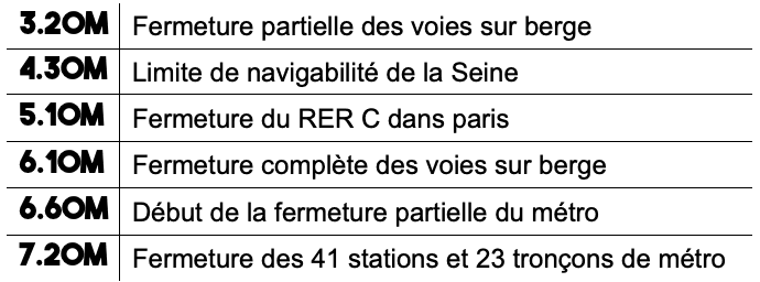 Conséquences des crues de la Seine en fonction du niveau de l'eau au pont d'Austerlitz (Paris)