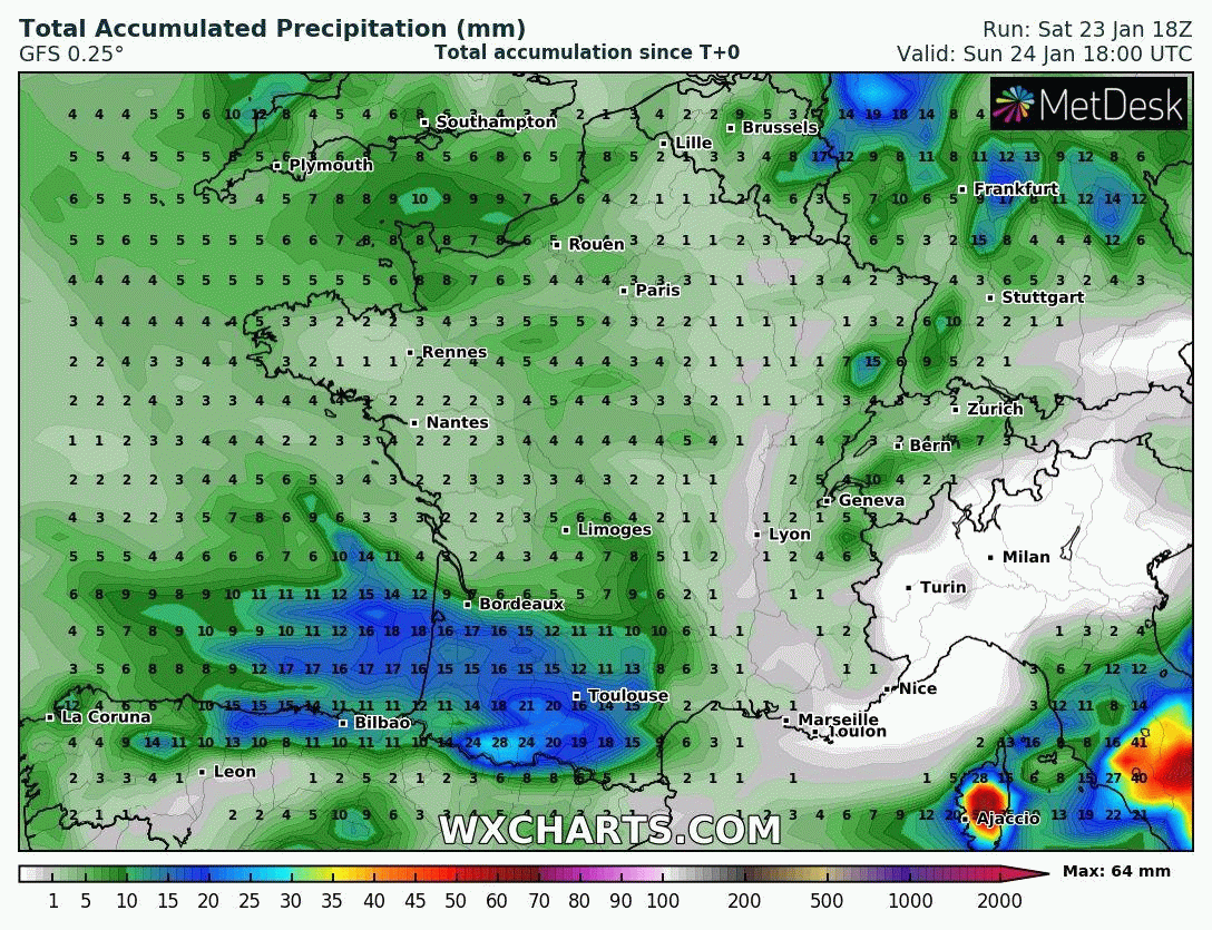 Malheureusement, le mois de décembre a déjà été excessivement humide (+57% d'anomalie nationale >>) tout comme cette première moitié de janvier. De ce fait, les sols sont gorgés d'eau sur la quasi-totalité du pays, et les quantités attendues devraient provoquer une pleine saturation, de quoi envisager de potentielles inondations en de nombreux secteurs...