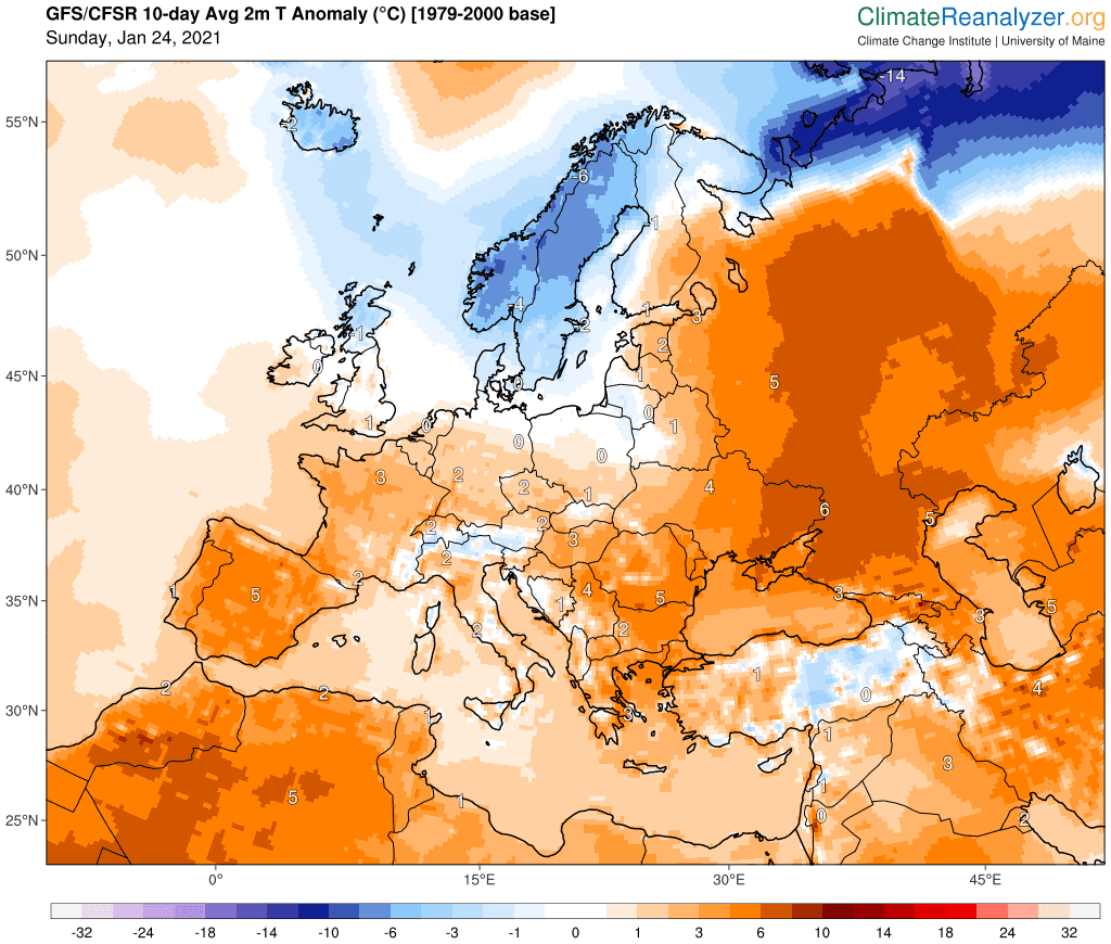 Anomalie de température sur 10 jours - période du 24 janvier au 02 février 2021 - ClimateReanalyzer