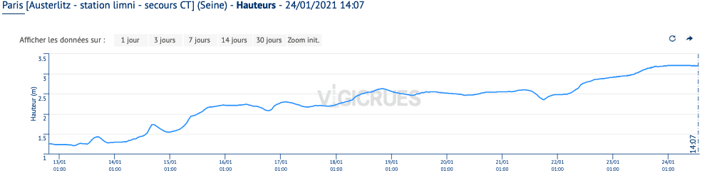 Évolution du niveau de la Seine au pont d'Austerlitz (Paris) - période du 13 au 24 janvier 2021 - Vigicrues