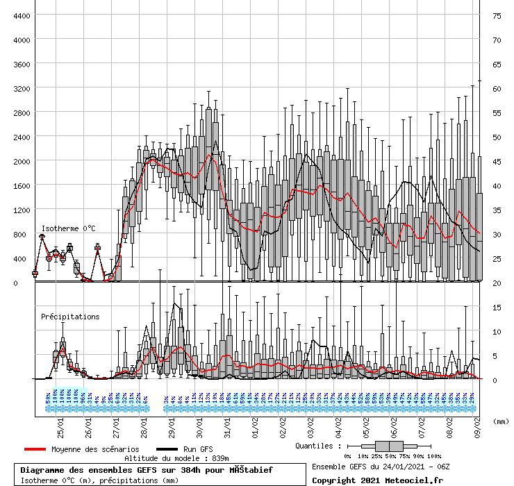 Précipitations et altitude de l'isotherme 0°C à Métabief (Doubs) - scénarios du 24 janvier au 09 février 2021 - ensemble GEFS