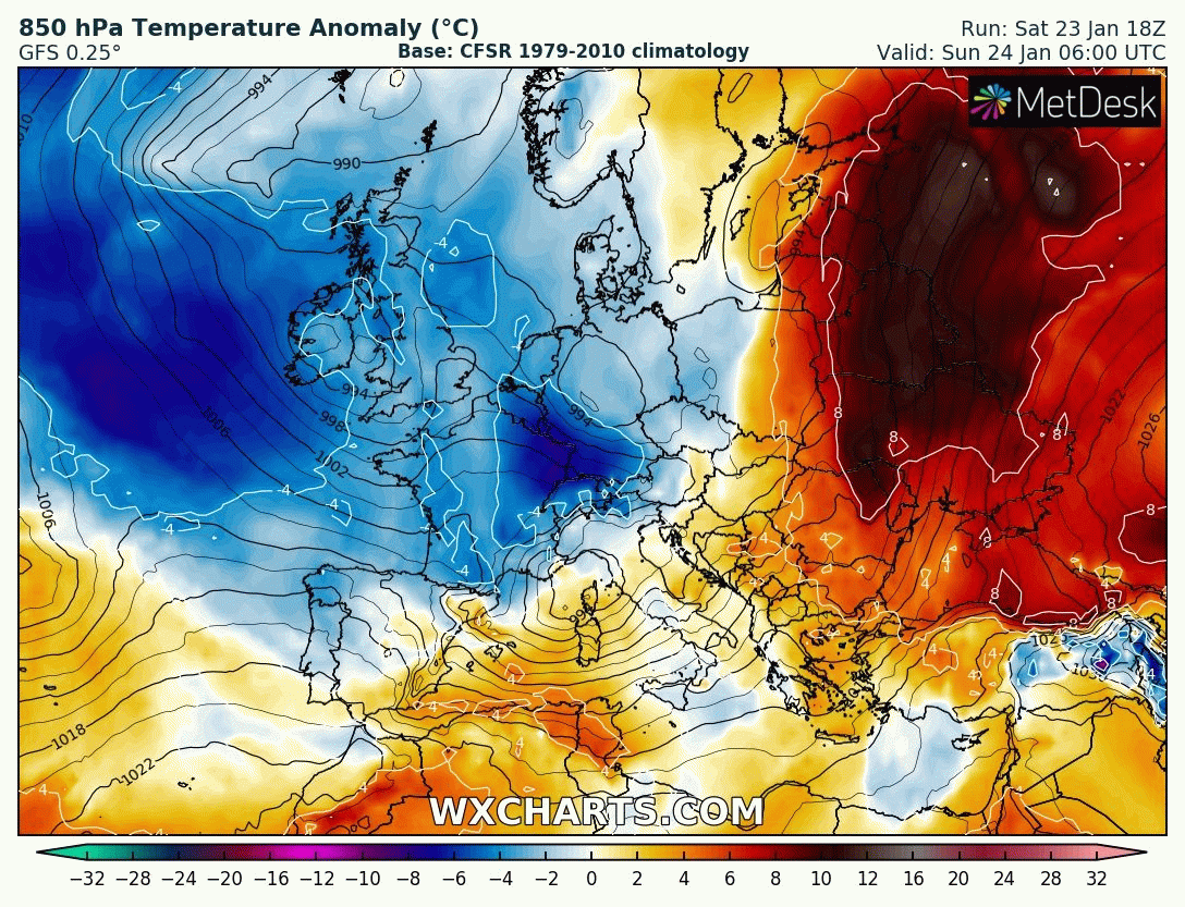 Anomalie de température de la masse d'air (à 1500m d'alt.) - du 24 au 30 janvier 2021 - Modèle GFS via WXCharts