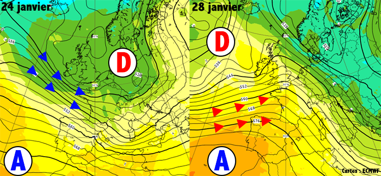 Situation générale observée le 24 janvier et prévue le 28 janvier 2021 - modèle CEP via ECMWF