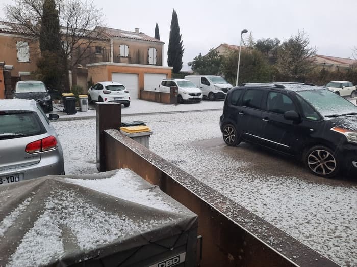 Les grêlons ont parfois atteint 2cm de diamètre près de Montpellier ce dimanche 22 mars avec d'importantes accumulations au sol – Photographie : Christine Jnn à Saint-Jean-de-Védas (34)