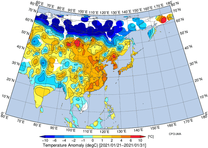 Carte des anomalies de températures en Asie sur la période du 21 au 31 janvier 2021 - via JMA (Agence météorologique du Japon)